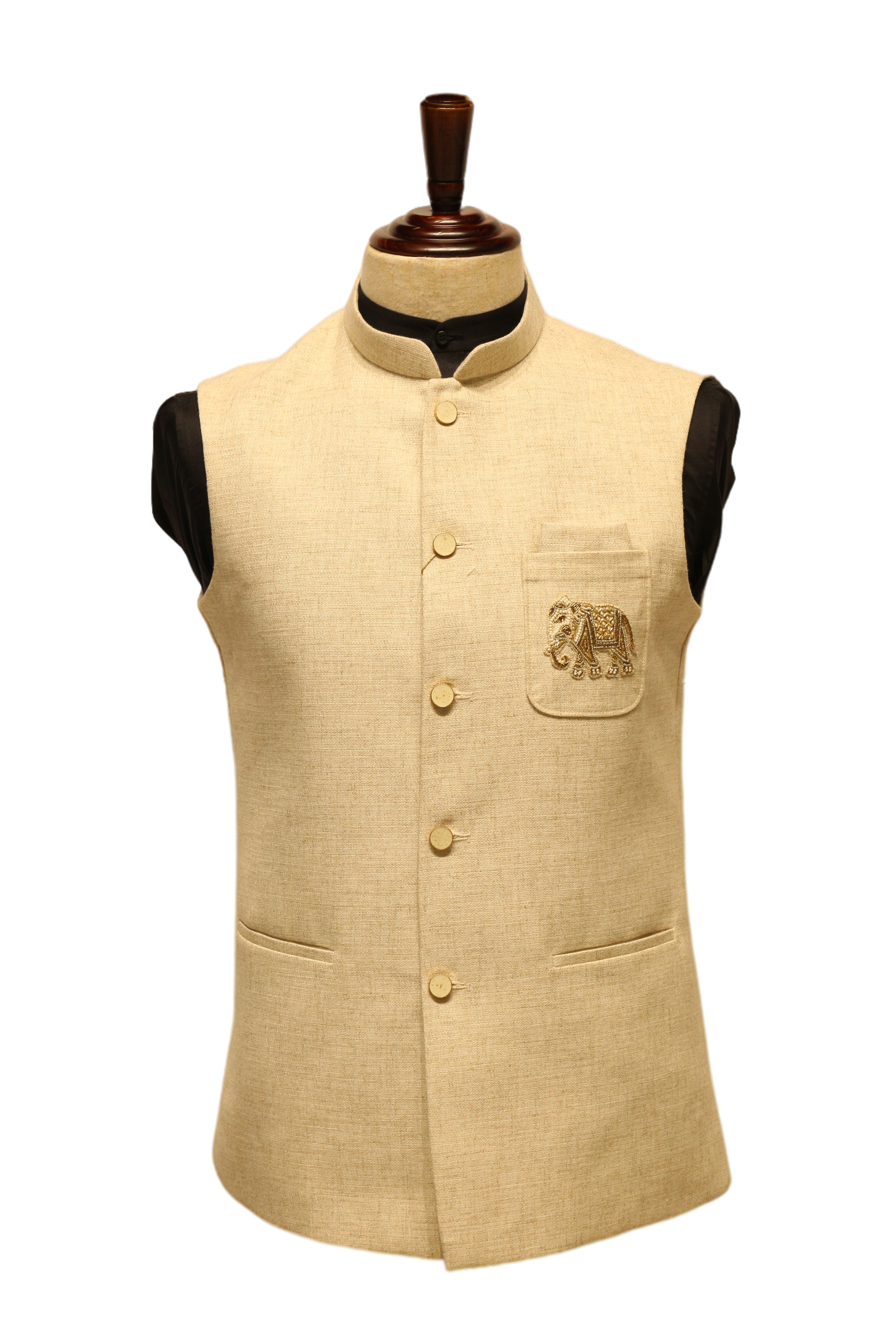 - The waistcoat showcases a subtle, textured pattern and a beautifully embroidered elephant detail on the pocket, adding a touch of unique style.