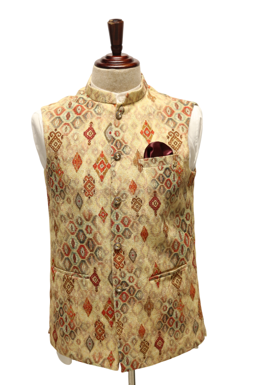 - This elegant waistcoat is crafted from a luxurious, textured fabric.