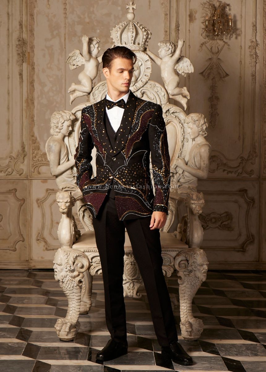 - Intricate decorative motifs in burgundy and gold, carefully arranged across the suit to form a striking, ornamental design that radiates regal sophistication