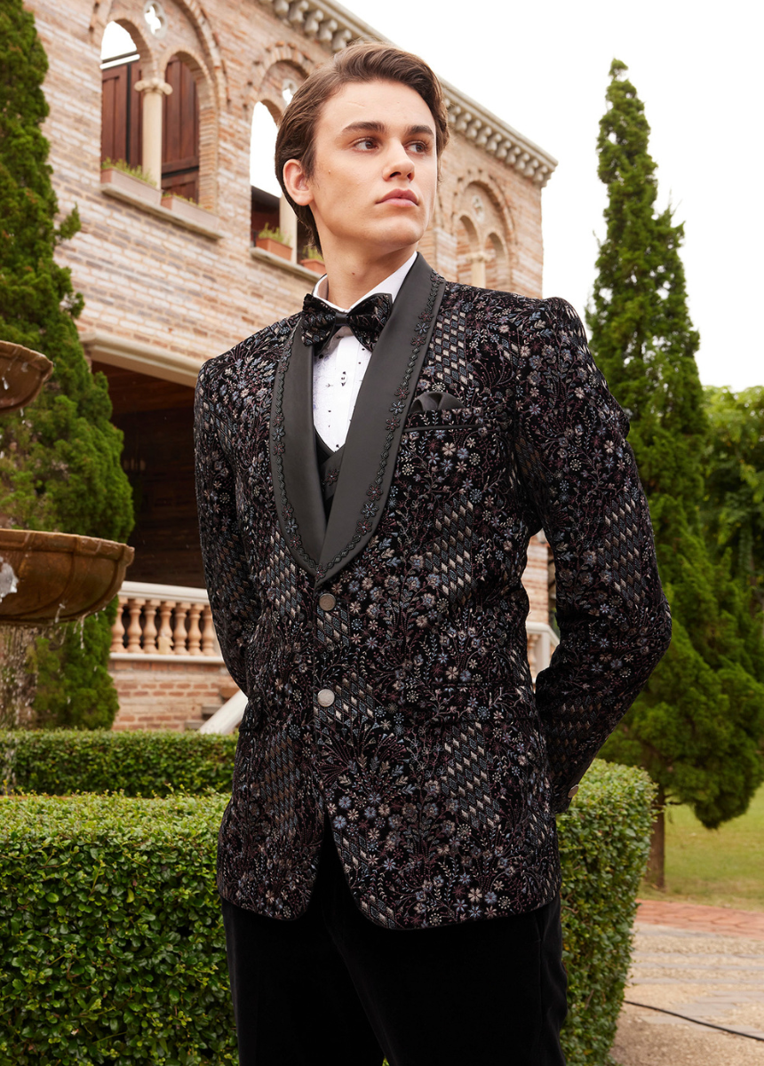 - The jacket is primarily black, elevated with a subtle floral embriodered pattern that catches the light for a refined, eye-catching effect