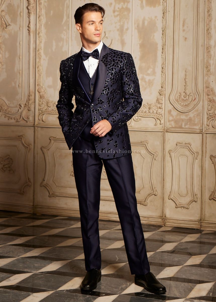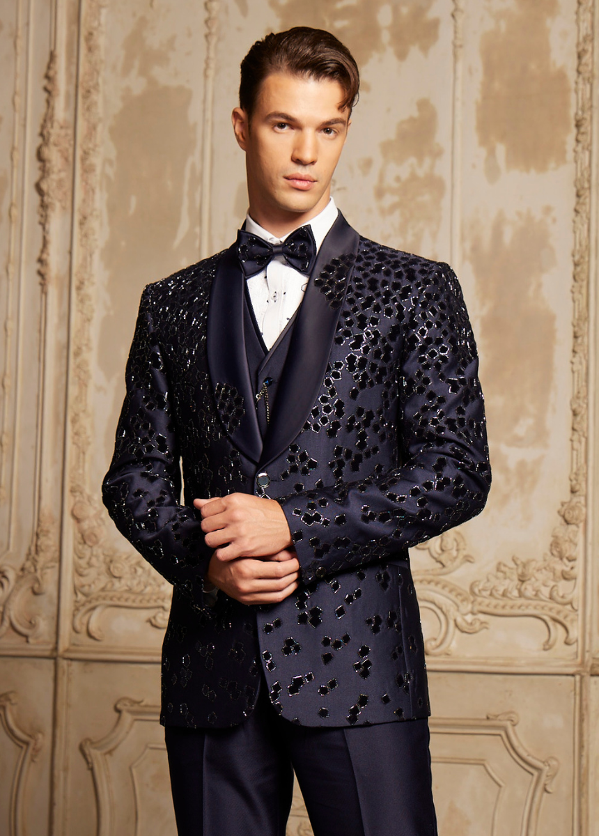 - A deep midnight navy base that provides the perfect canvas for bold black embellishments and satin lapels