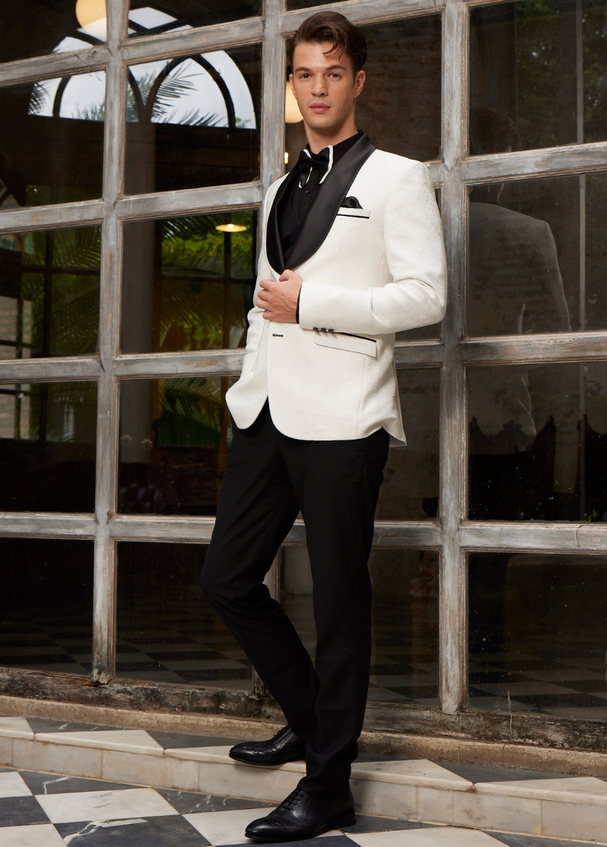- Crisp white, contrasted elegantly with deep black satin — a timeless combination that evokes classic eveningwear charm